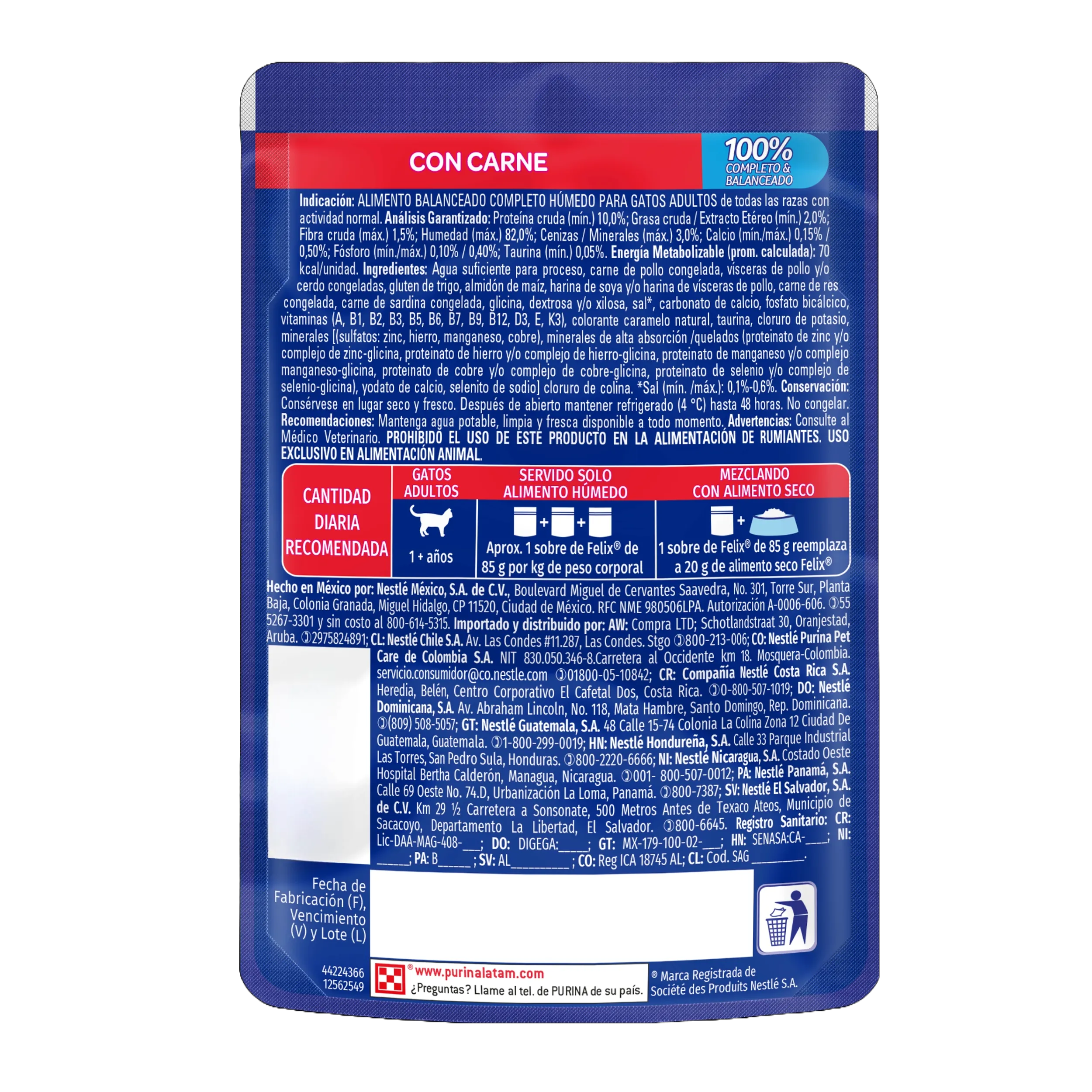 Alimento húmedo 100% completo y balanceado para gatitos en desarrollo FELIX® en formato sobre con carne. Jugosos y tiernos trocitos en una salsita sin igual, para deleitar al paladar de los gatos.