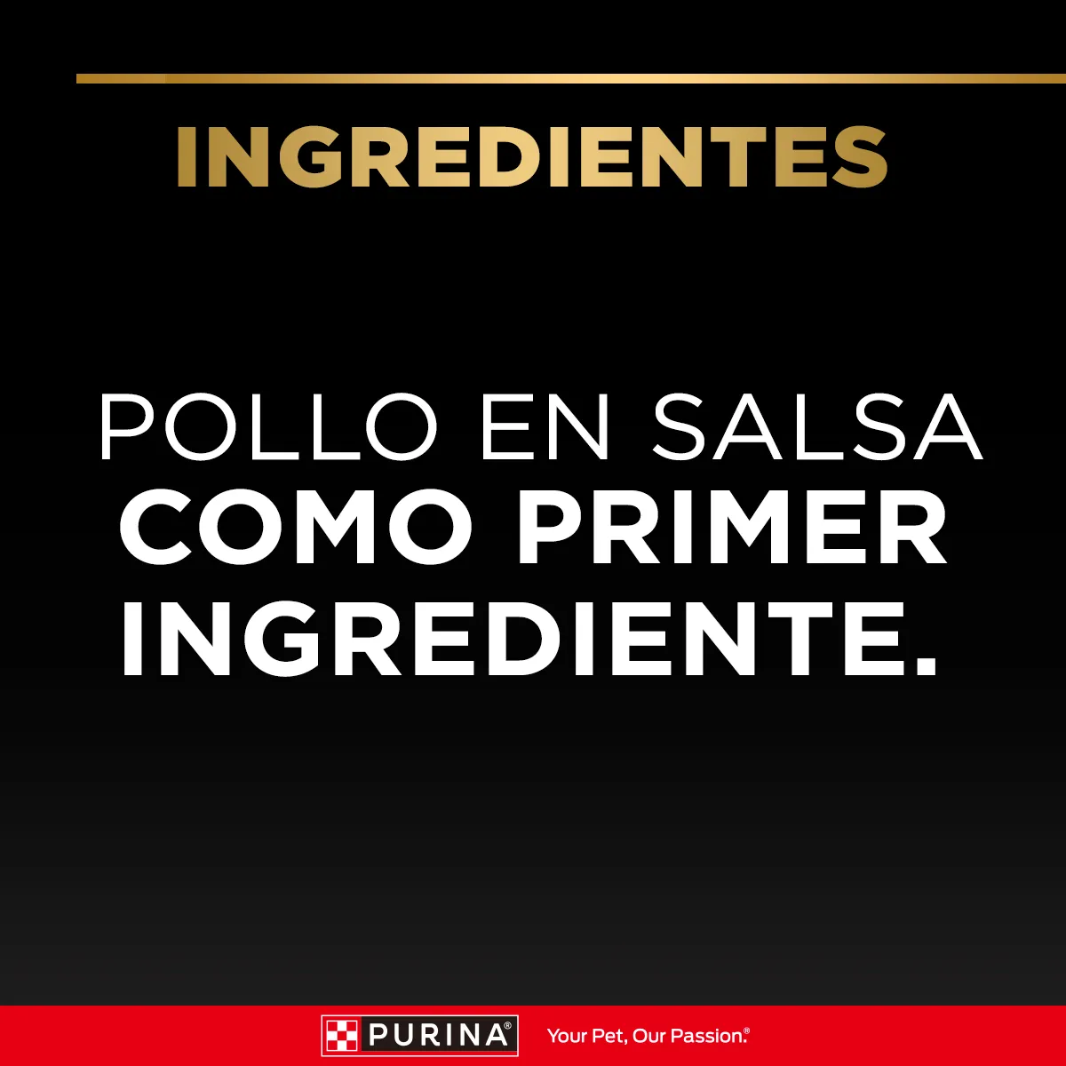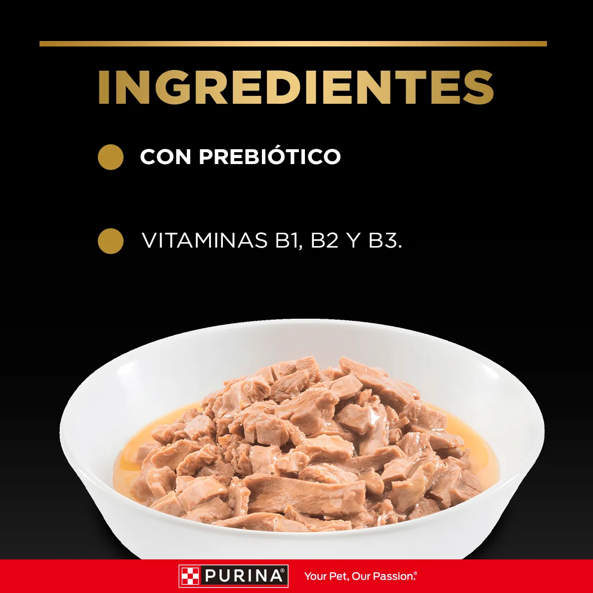 Agua suficiente para proceso, carcasa de pollo, gluten de trigo, carne de pollo, hígado y/o vísceras de cerdo, hígado de pollo y/o carne de pavo, concentrado proteico de soya, almidón de maíz, inulina, fosfato dicálcico, cloruro de potasio, sal, carbonato de calcio, suplementos vitamínicos (A, D3, E, B1, B2, B3, B5, B6, B7, B9, B12, cloruro de colina), suplementos minerales (sulfato de zinc, proteinato de zinc, sulfato ferroso, sulfato de manganeso, proteinato de manganeso, sulfato de cobre, proteinato de cobre, yodato de calcio, selenito de sodio).
