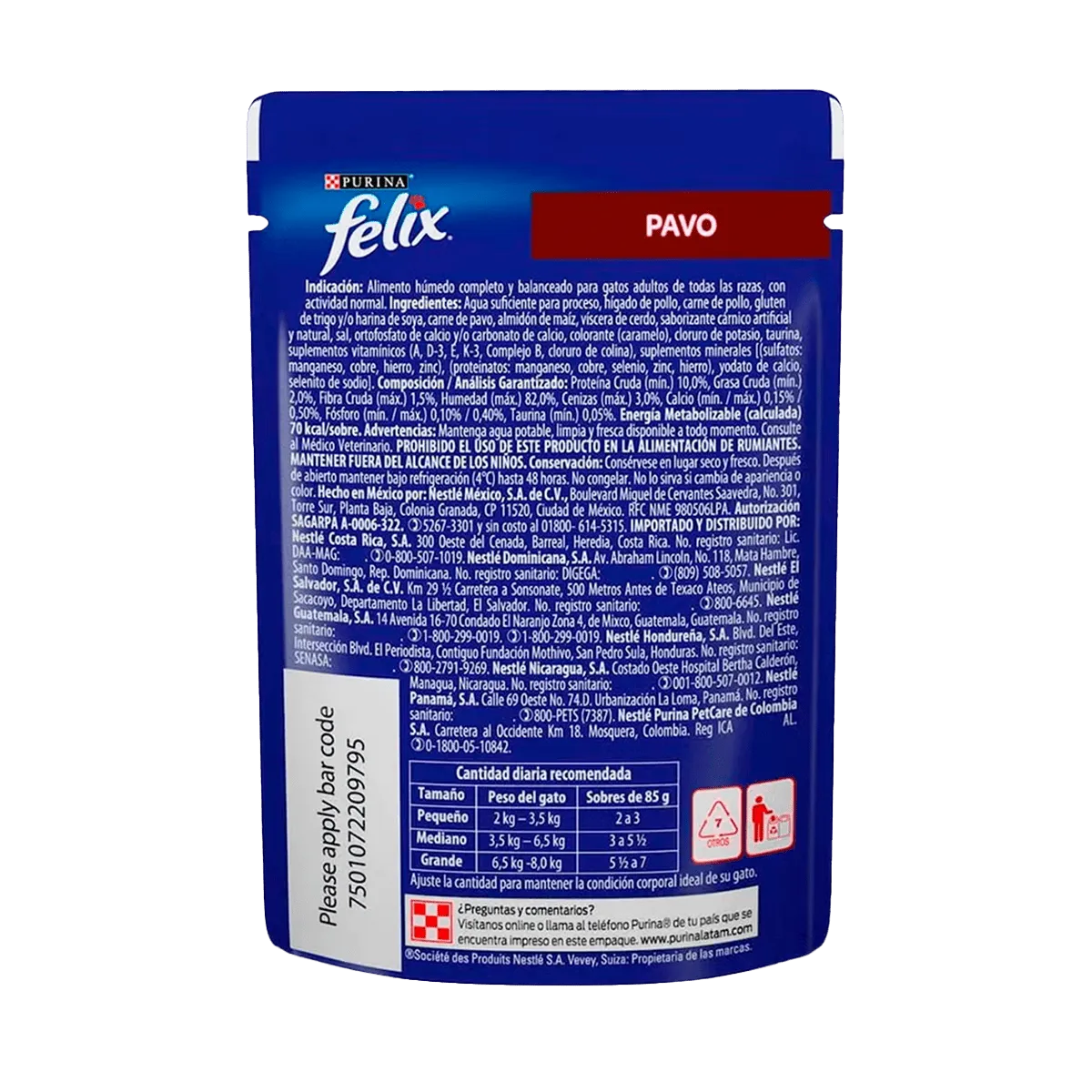 Alimento húmedo para Gatos Felix pavo en salsa. Delicioso alimento húmedo completo y balanceado para gatos en desarrollo, compuesto por trocitos de carne en salsa, para deleitar hasta al paladar gatuno más exigente.